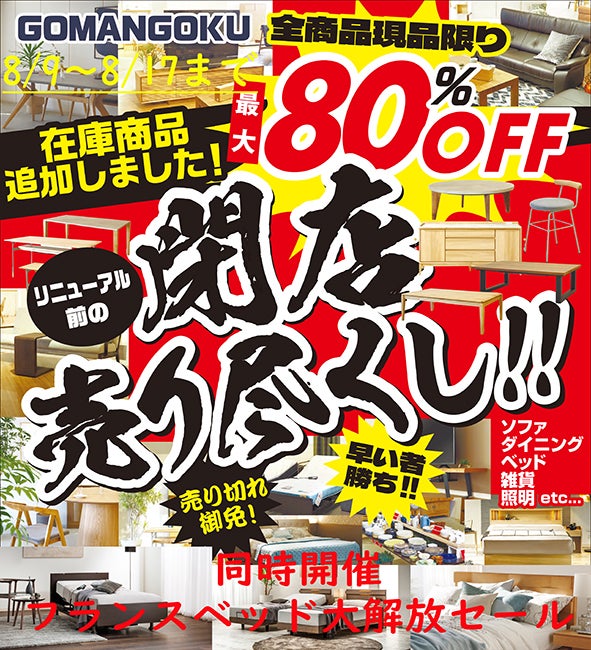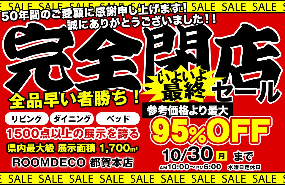 完全閉店セール 50年間ご愛顧頂きありがとうございました。 in ROOMDECO 都賀本店千葉県のアウトレット家具 インテリア のセール ・イベント情報ならSeiloo。