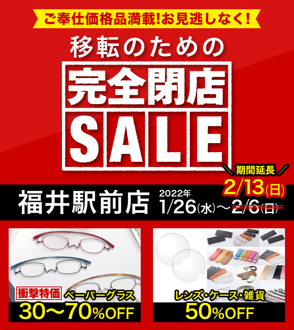福井駅前店 移転のための閉店セール 終了しました鯖江製ペーパーグラス - 薄型メガネ・老眼鏡 リーディンググラス ・サングラス。