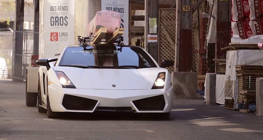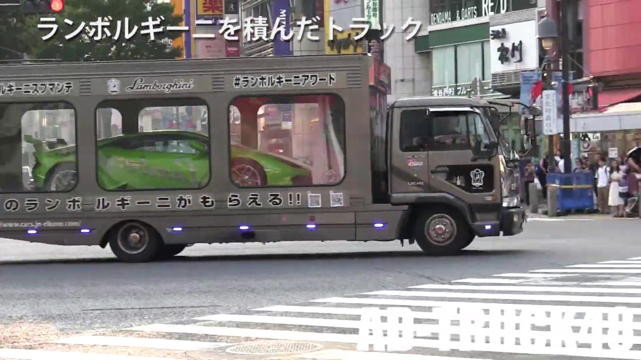 渋谷を走行する、ランボルギーニを積んだトラック - YouTube。