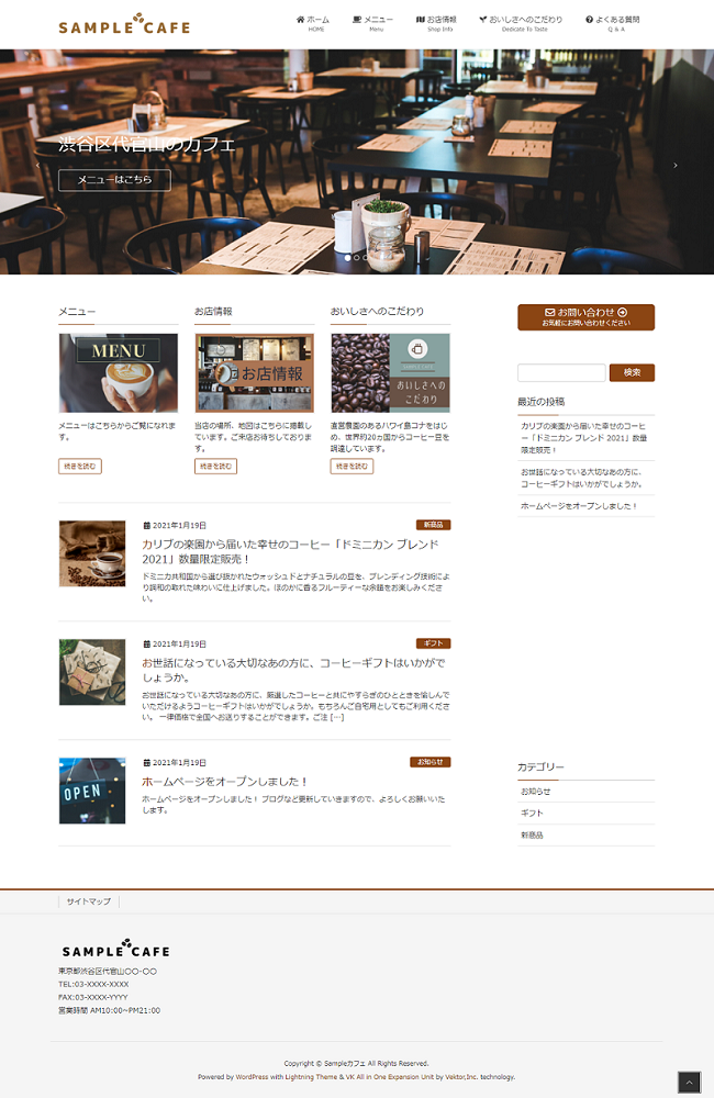 ワードプレス Lightningテーマで架空のカフェのホームページを作ってみました。プログラミング独学の軌跡。