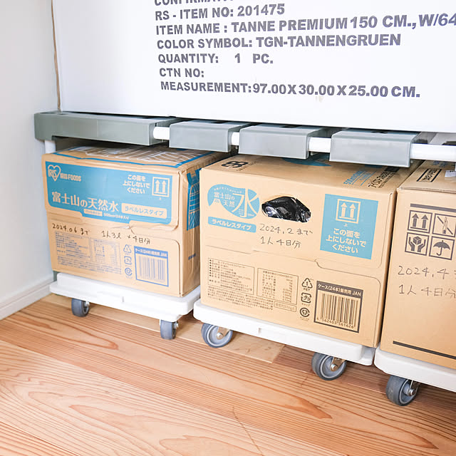 無印良品で防災用品の収納ダイソーの防災用品と保存食の消費期限切れ対策 - キッチン収納。