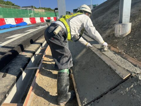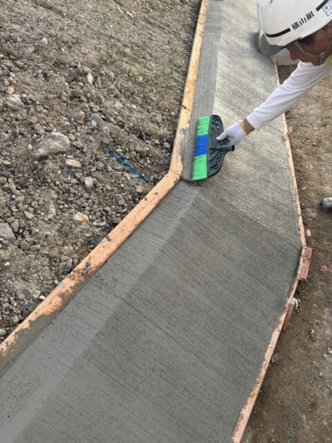 斜面の裾をコンクリートで均してホウキ目で仕上げ作業を施工しました。