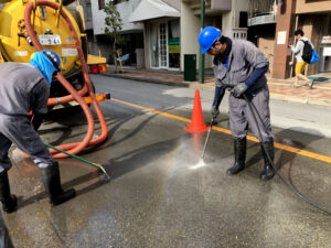 道路に生コンこぼしてしまったら掃除が大変ですよ。株式会社assis。