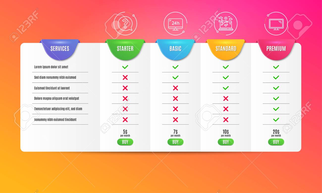 24時間サービス、クエスチョンマーク、飛行機の旅行アイコンのシンプルなセット。比較表。サインを監視します。電話サポート、ヘルプサポート、チェックイン。コンピュータコンポーネント。ビジネスセット。価格プラン。ベクターのイラスト素材・ベクターImage 125606429。