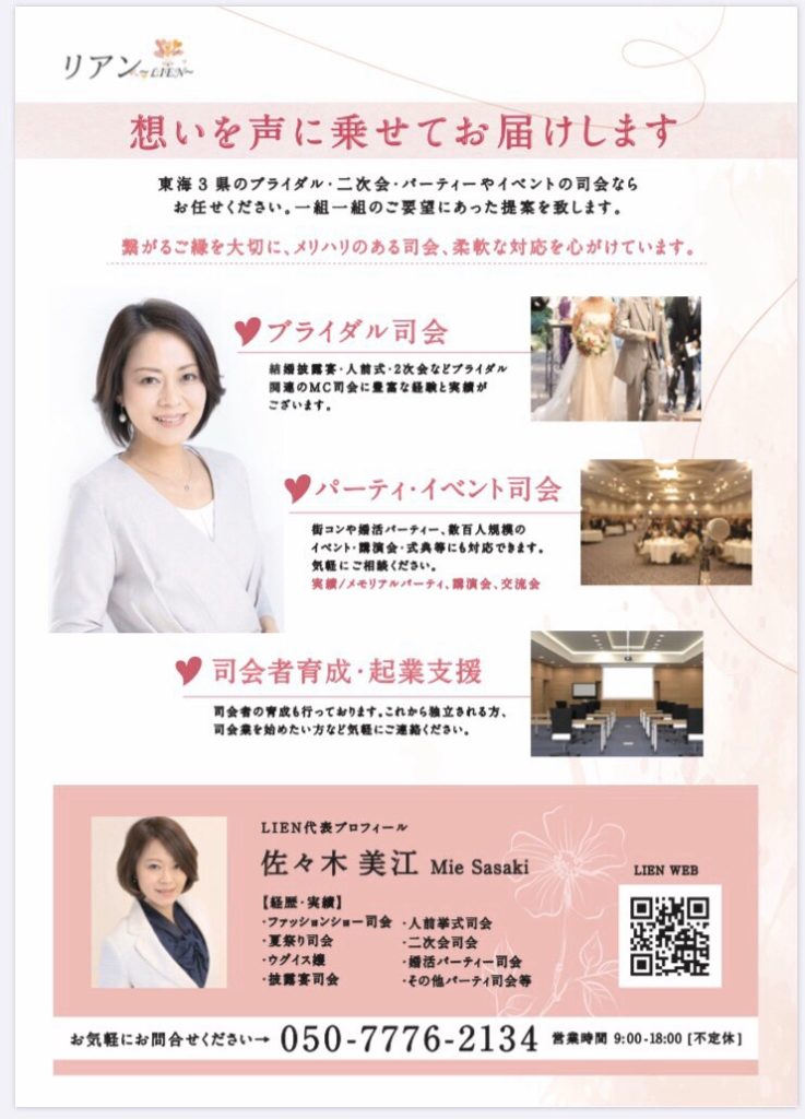 チラシも完成しました!名古屋の結婚式司会・ブライダルや二次会の司会ならLIEN「リアン」へ。