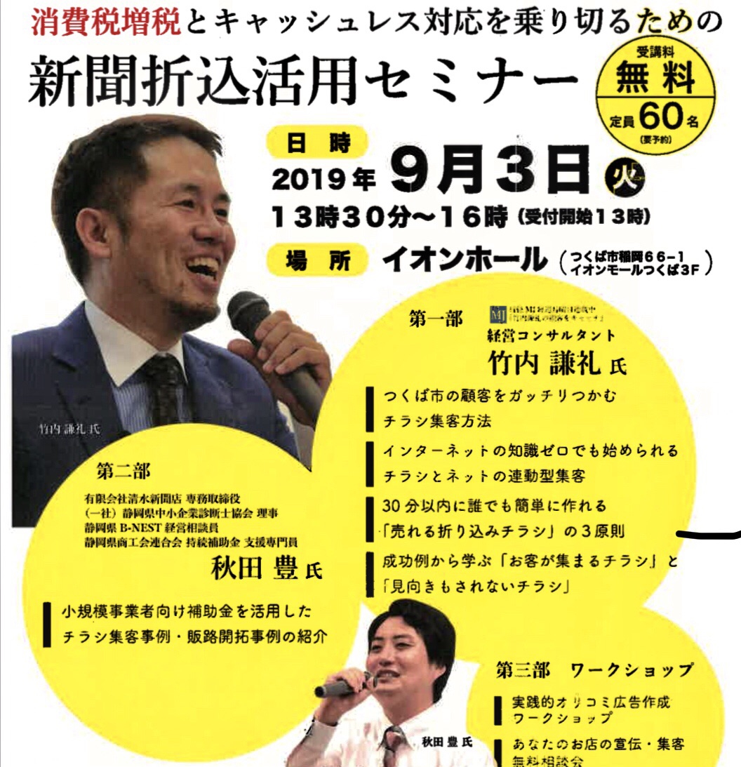 コラボセミナーにご興味はありませんか?株式会社U-CHAN 中小企業診断士秋田豊元 有限会社清水新聞店 持続化補助金等補助金支援 補助金を活用した集客・広告制作支援。