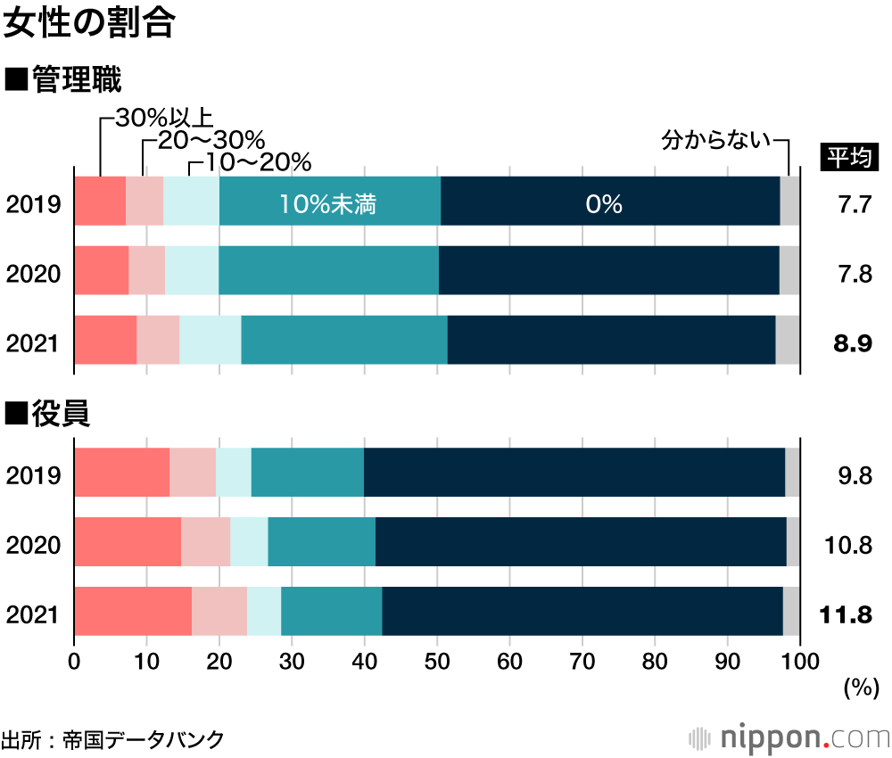 女性管理職の平均割合、過去最高も8.9%にとどまる株式会社帝国データバンクのプレスリリース。