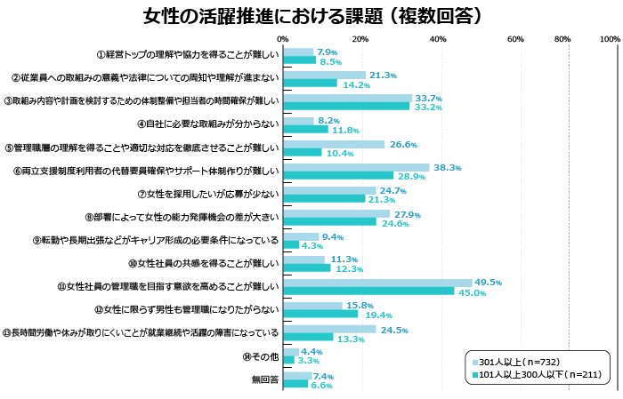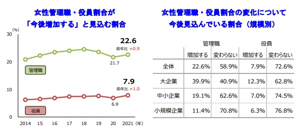 女性管理職の割合は平均10.9%、初の1割超え 課題認識、「女性の昇進意欲」が企業規模間で大きな差株式会社帝国データバンクのプレスリリース。