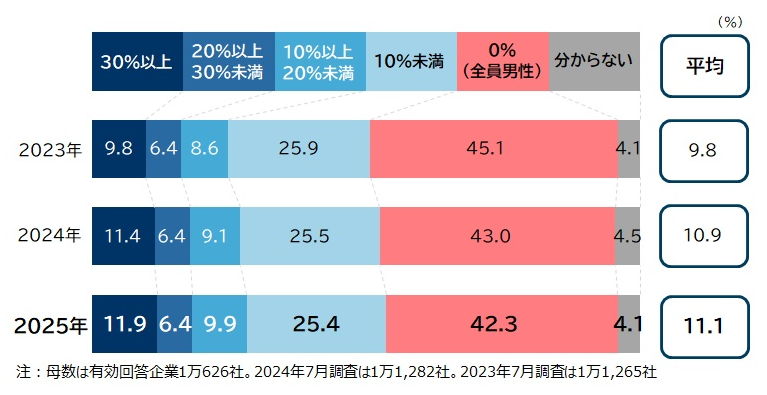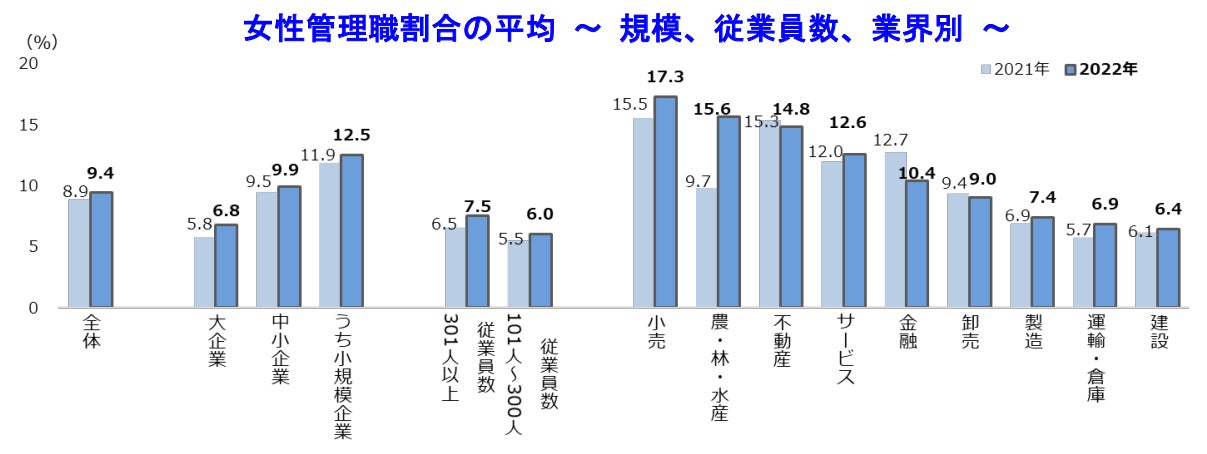 女性管理職の平均割合」は8.9%で過去最高を更新。企業規模や業界で女性登用に格差も、男性育休に注目が集まる経営プロ - 「ヒト」から経営を考える。