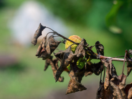 バラ色のリンゴアブラムシ虫こぶ赤みがかった灰色の葉Dysaphisplantaginea害虫寄生性の病気の昆虫は、作物マルスの損失病を引き起こします。減少する果物の葉の品質変形オオバコの木の詳細のクローズアップの写真素材・画像素材Image 161445021。