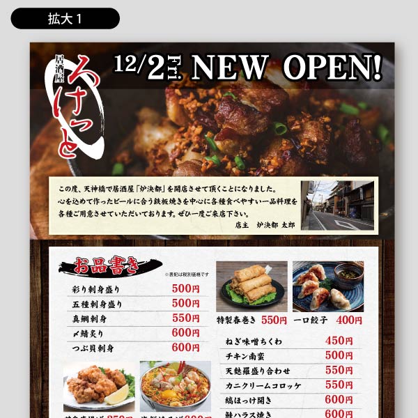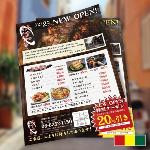 居酒屋のオープン用2チラシ印刷のロケットプリント。