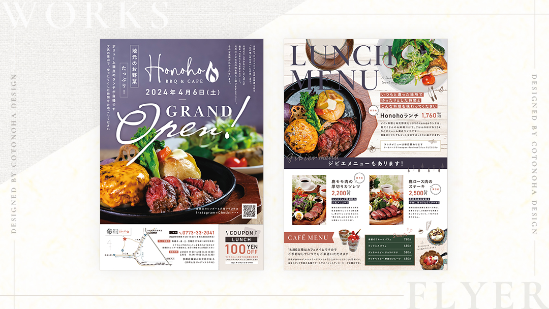 制作実績 レストラングランドオープンチラシBBQ & CAFE honoho様 - コトノハデザインブログ。