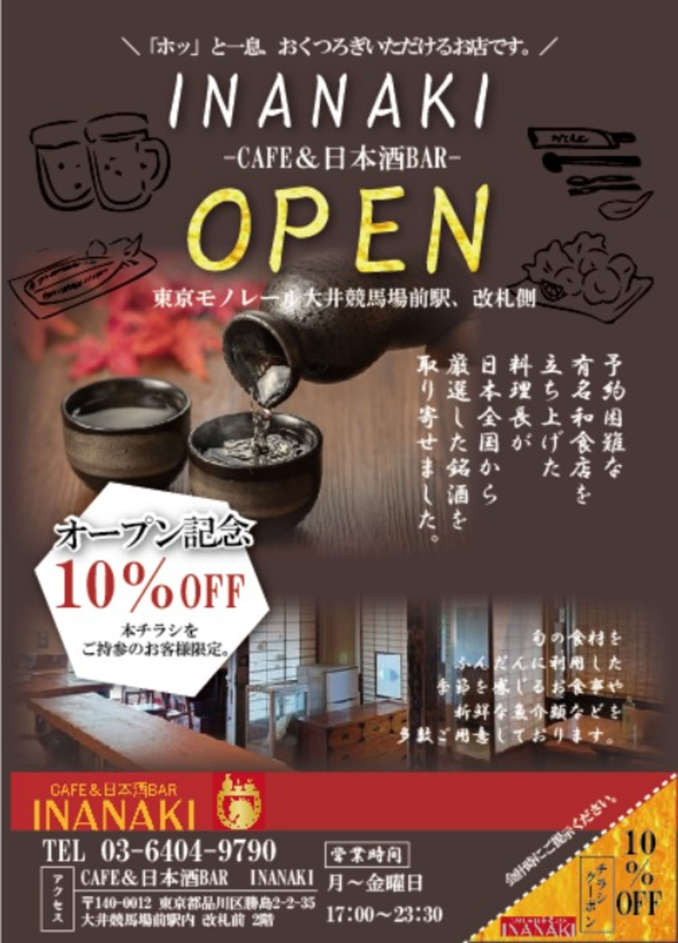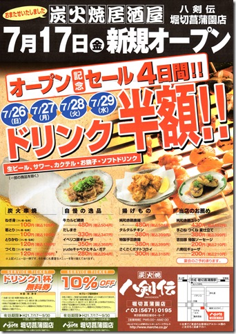 創作居酒屋B5チラシデザイン事例新規OPEN告知、半額訴求チラシ作成専門 デザイン+印刷のCHIRASAKU チラサク。
