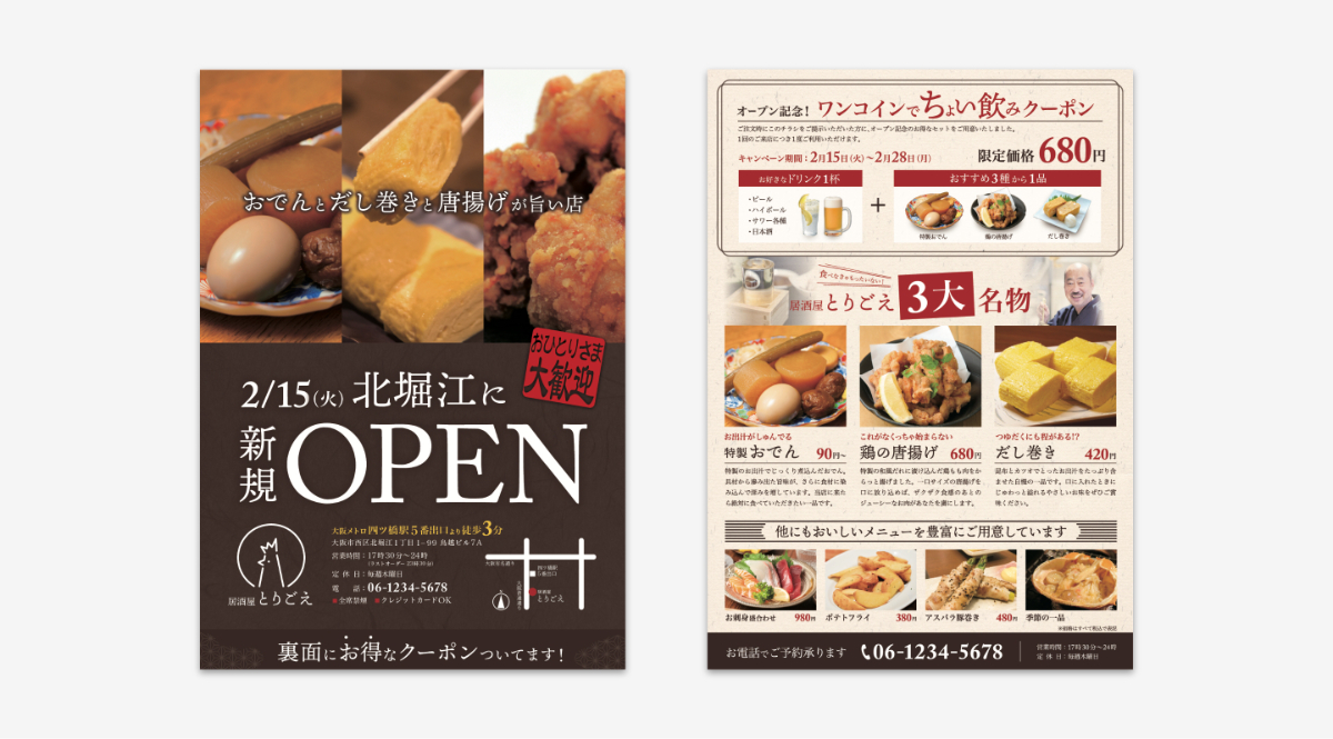 改装オープン告知、期間限定商品告知、クーポン券、店舗概要飲食店のチラシデザイン作成・印刷なら飲食チラシ制作.com。