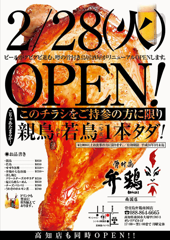 栃木県 ニューオープン告知チラシ 焼鳥屋飲食店のチラシデザイン作成・印刷なら飲食チラシ制作.com。