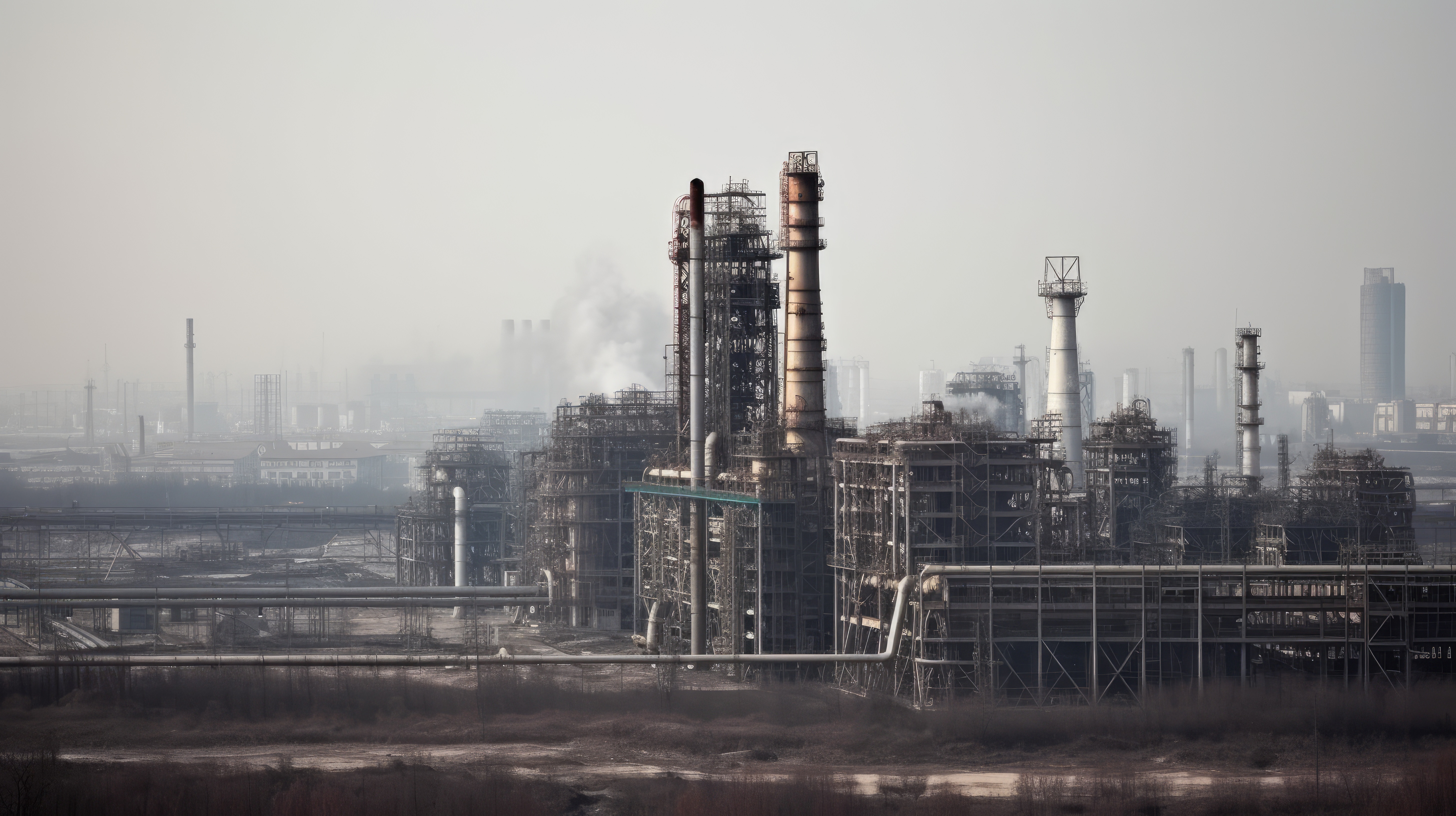 工場の排気ガスで空が暗くなり、大気汚染が激化する工業地帯の戦いPremium AI生成画像。