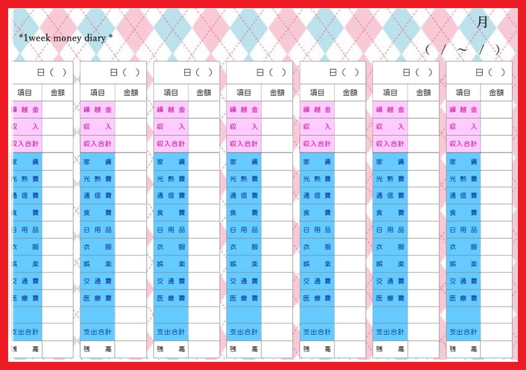 印刷&手書きで書き方が簡単なアーガイル柄の日別で使える家計簿💗無料ダウンロード「かわいい」雛形・テンプレート素材。