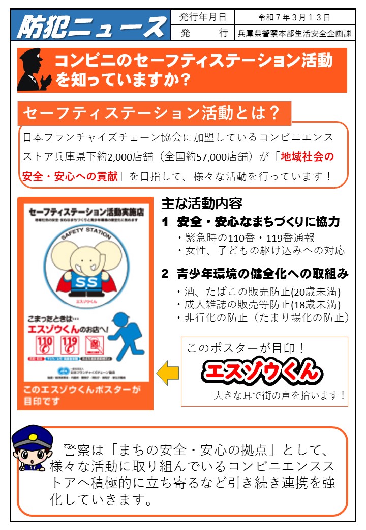 兵庫県警察安全安心情報 on X: " コンビニのセーフティステーション活動 生活安全企画課 警察は「まちの安全 ・安心の拠点」として、様々な活動に取り組んでいるコンビニへ積極的に立ち寄るなど連携を強化しています。「エスゾウくん」ポスターが目印です。#日本。