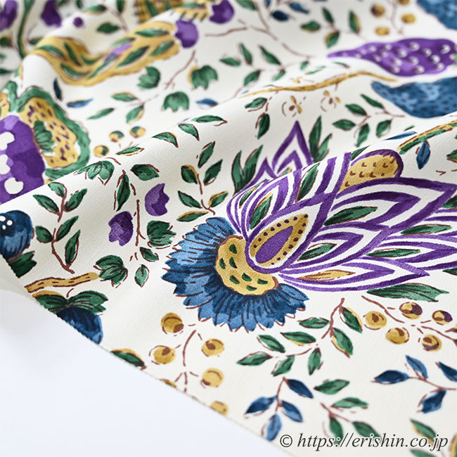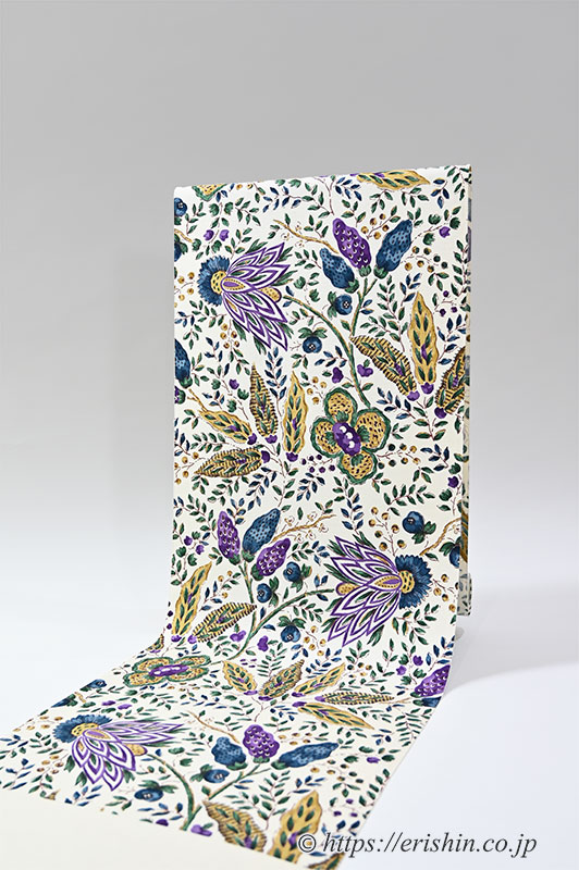 お誂え 多ち花 染名古屋帯オランダ更紗 紫×青藍色×桑染色×深緑・真綿紬 多ち花『着物・呉服えり新』。