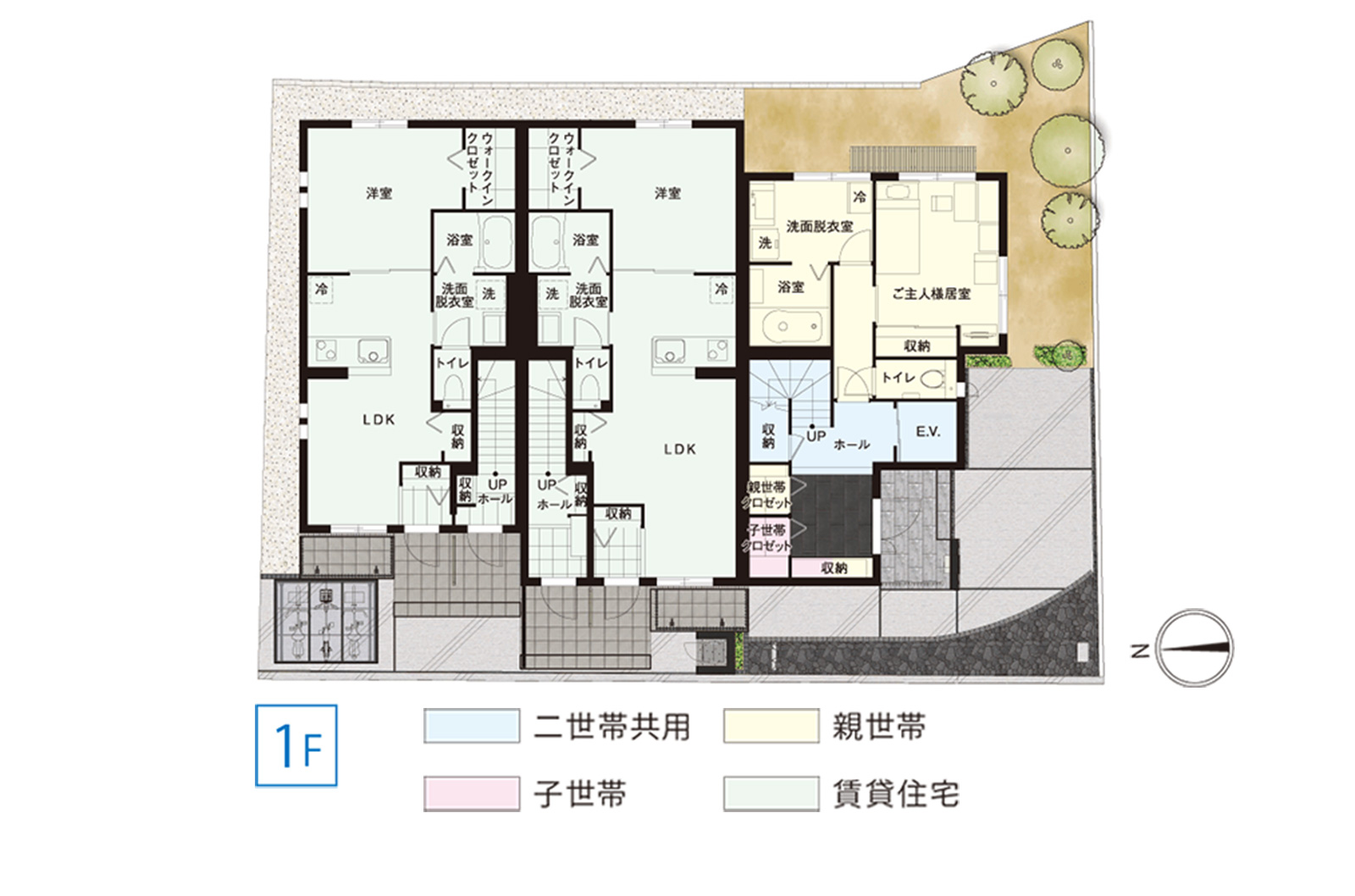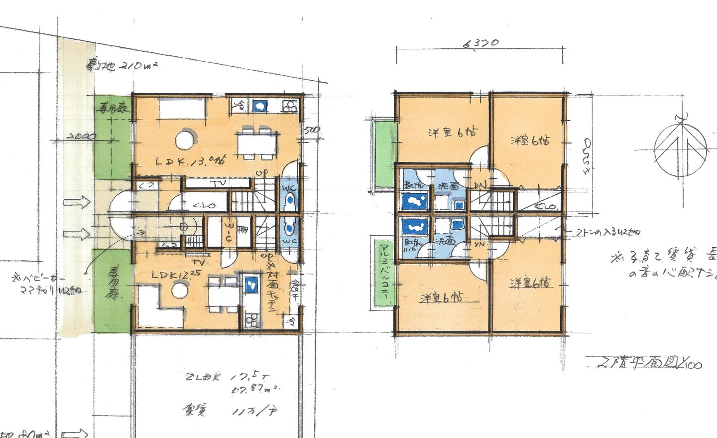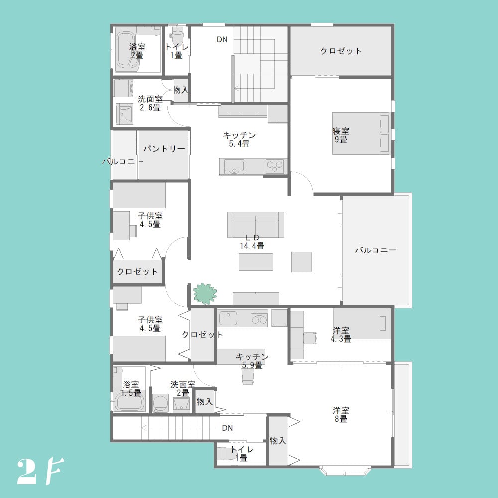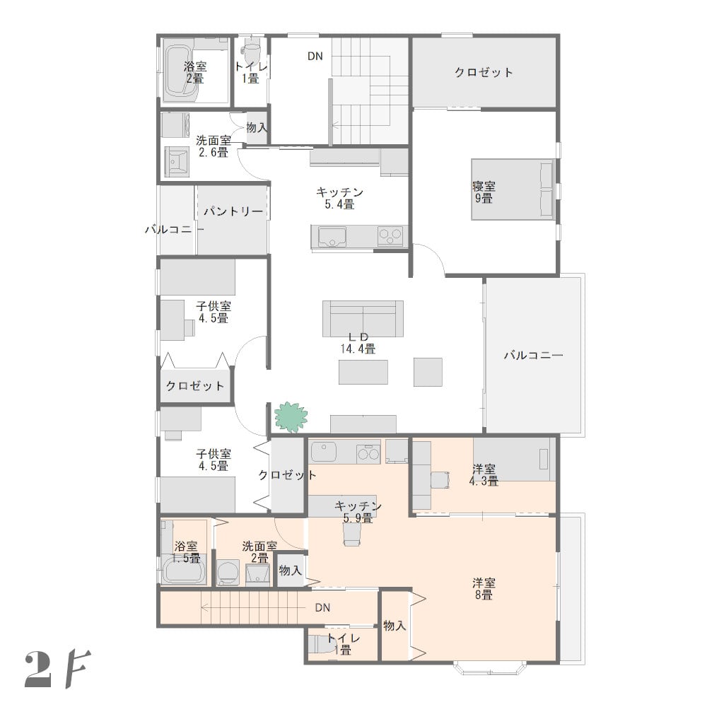 間取り 100坪 2LDK+4LDK 完全分離型二世帯住宅 西玄関。