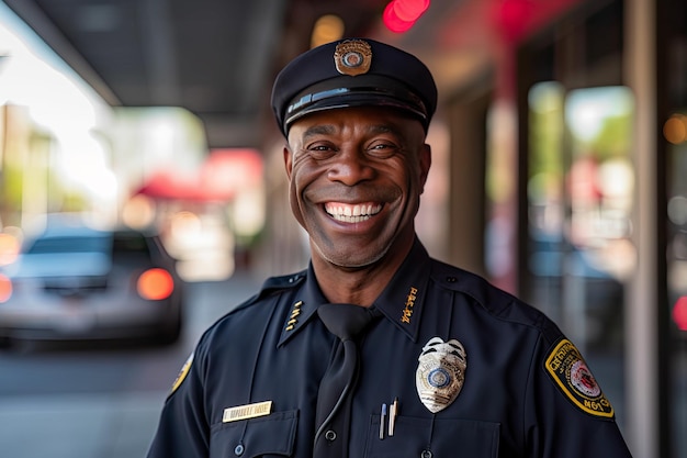 帽子をかぶって制服を着た街の通りで笑顔のアメリカ人警官を接写するPremium AI生成画像。