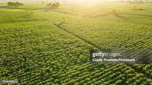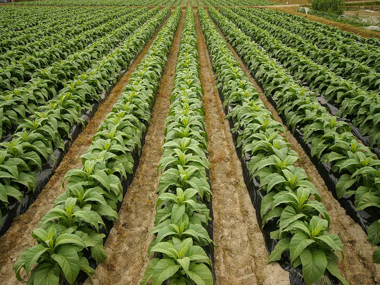 農村部の農業タバコ栽培のための高規格タバコ畑の空撮写真。