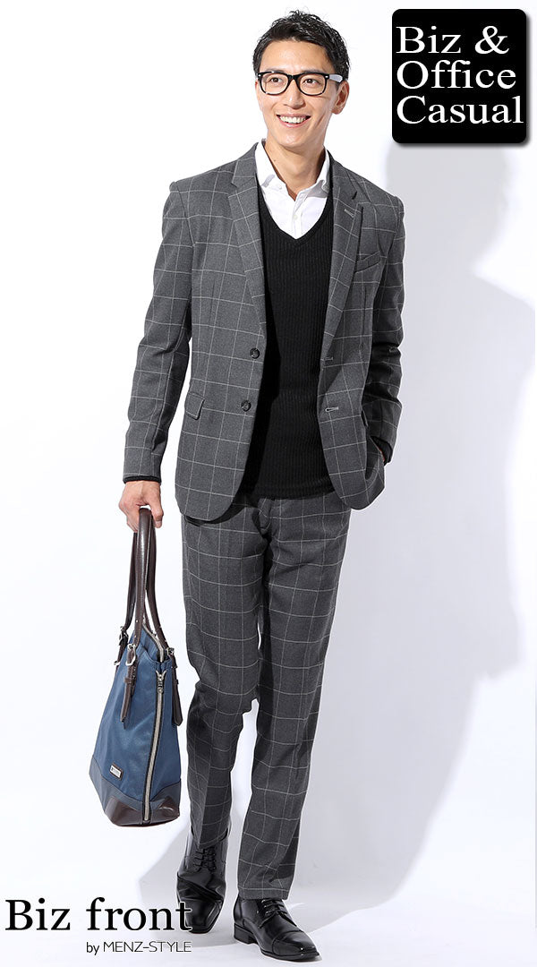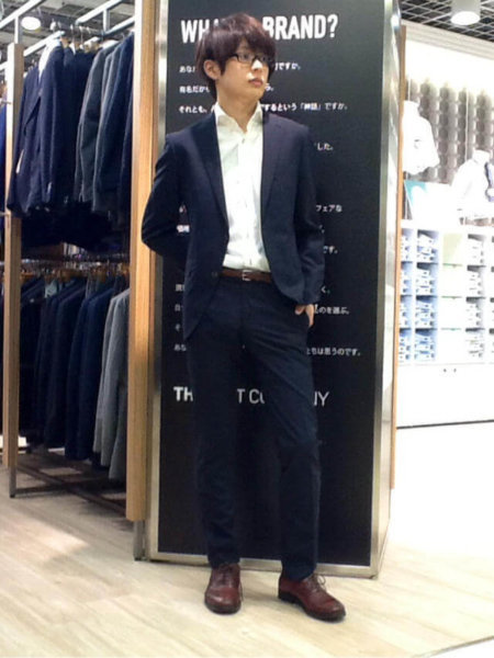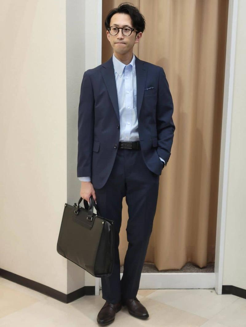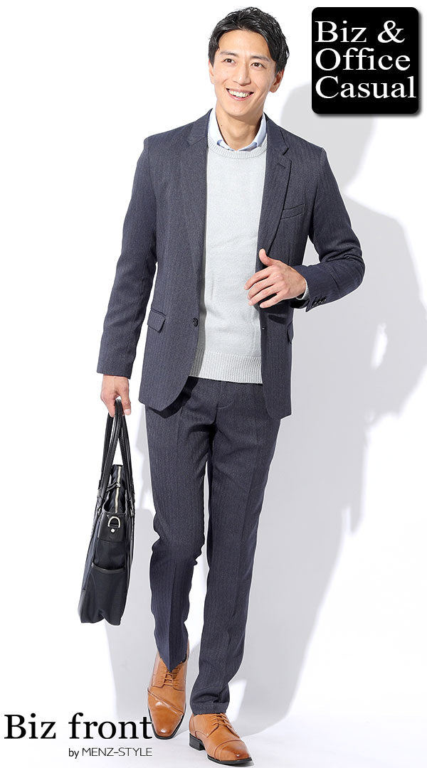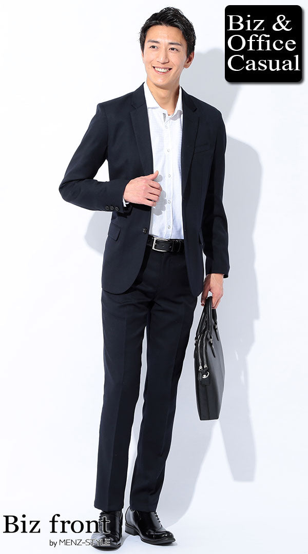 ネイビースーツ×ホワイトシャツ ノーネクタイスタイル biz18ss_1933のコーディネート例ビジネス・オフィス・スマートカジュアル専門通販。