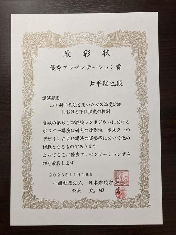 古平翔也さん 大学院自然科学技術研究科 エネルギー工学専攻 2年 が第61回燃焼シンポジウムにおいて優秀プレゼンテーション賞を受賞 - 機械工学科。