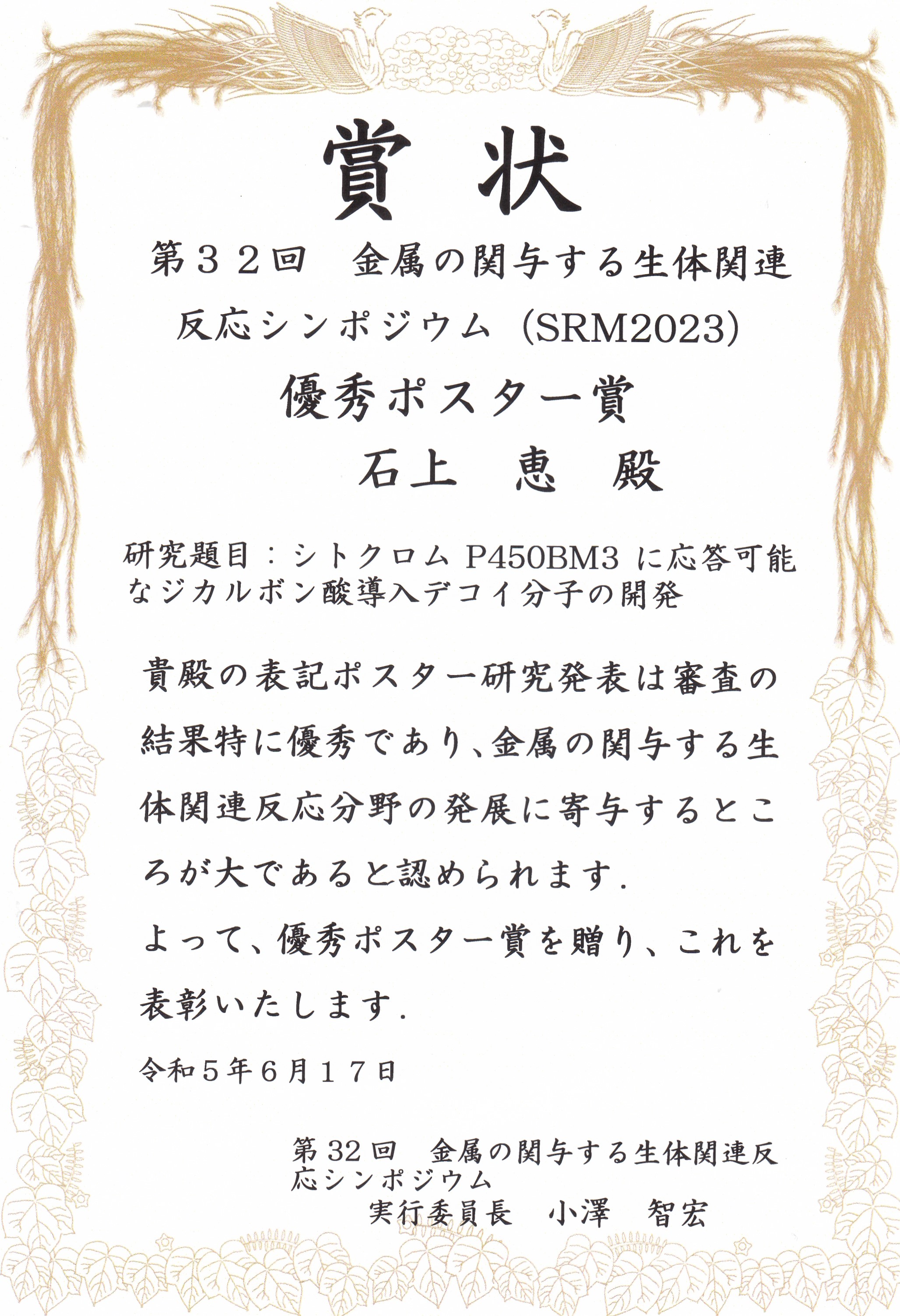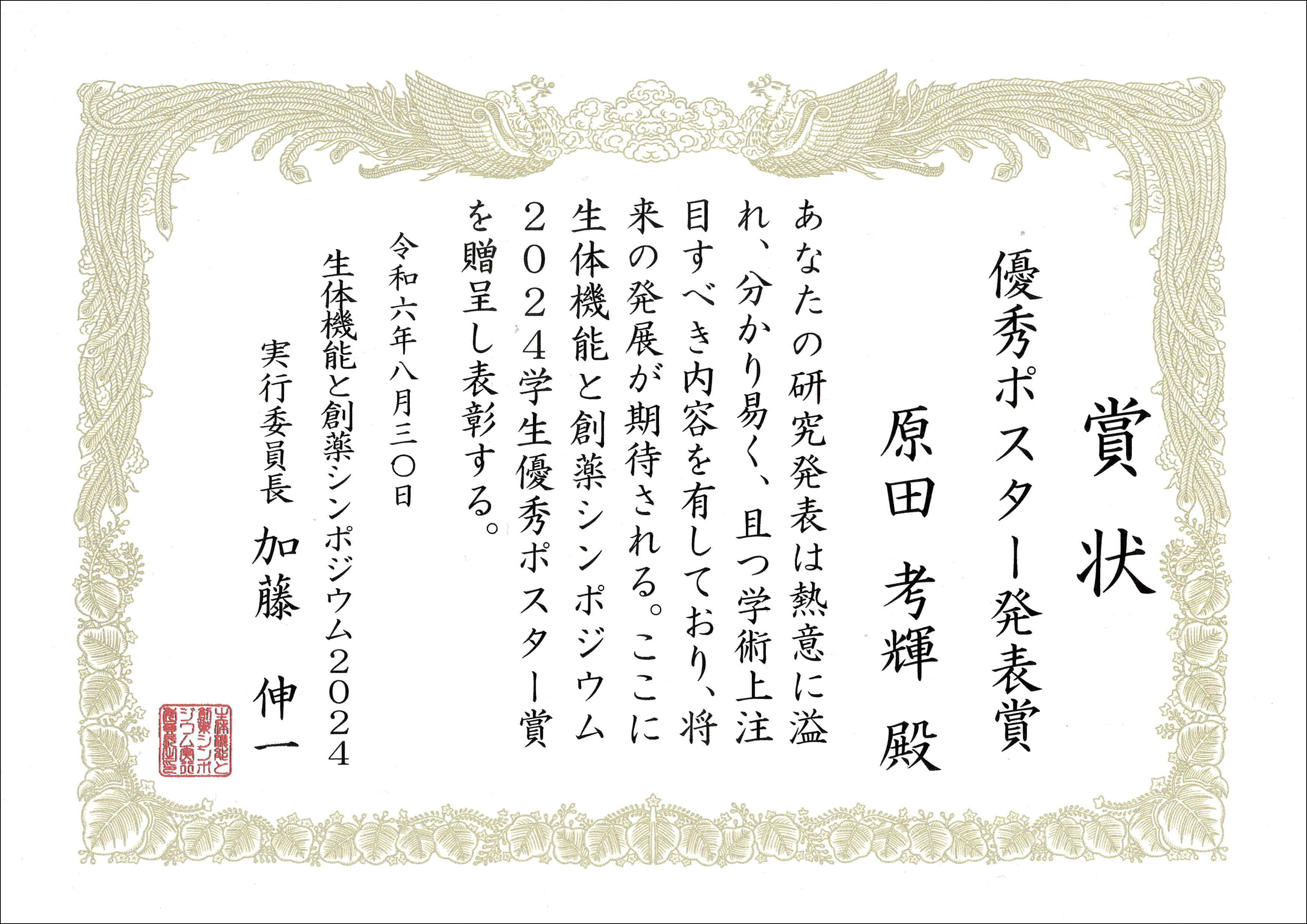 シナジーラボの原田考輝さんが生体機能と創薬シンポジウム2024京都において優秀ポスター発表賞を受賞しました。