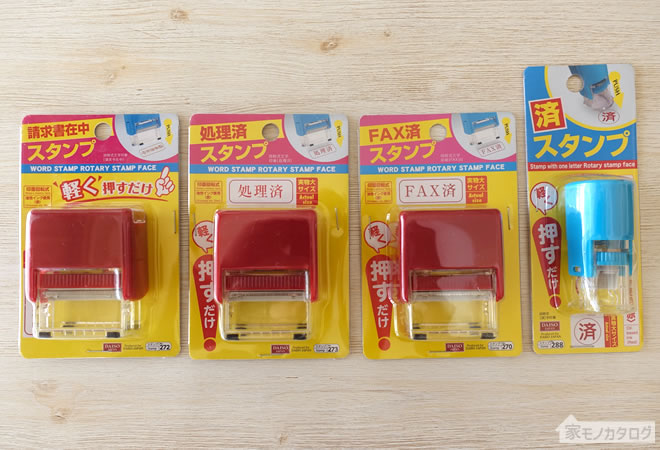 100均ダイソー「請求書在中・処理済みなど文字スタンプ」商品一覧。1個100円。