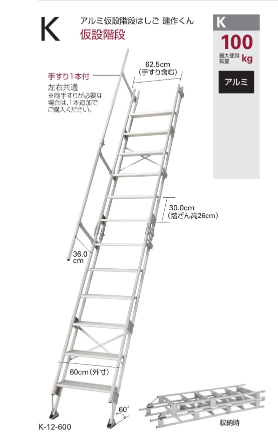 ハセガワ アルミ仮設階段はしご 建作くんK-11-600・K-12-450・K-12-600・K-13-600・K-14-60015841・15839・15842・15843・17617 15896・17618建築金物通販 秋本勇吉商店。