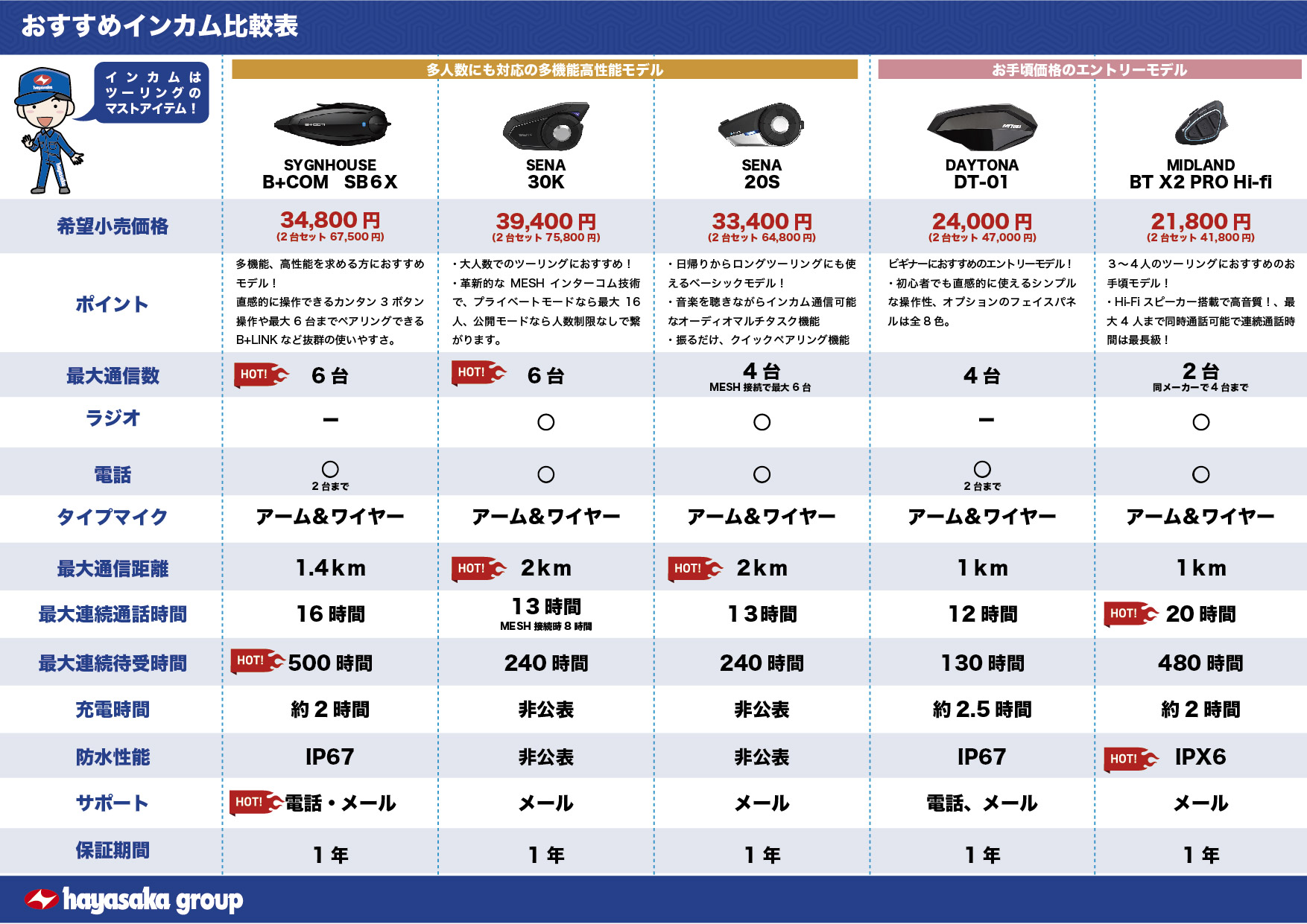 インカム比較表バイク・自転車の購入修理ならハヤサカサイクル。