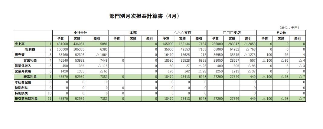 支社別実績比較表の書式テンプレート Word・ワードテンプレート・フリーBiz。