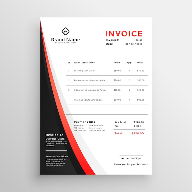 スタイリッシュな赤いテーマの請求書のテンプレートデザイン無料ベクトル素材。