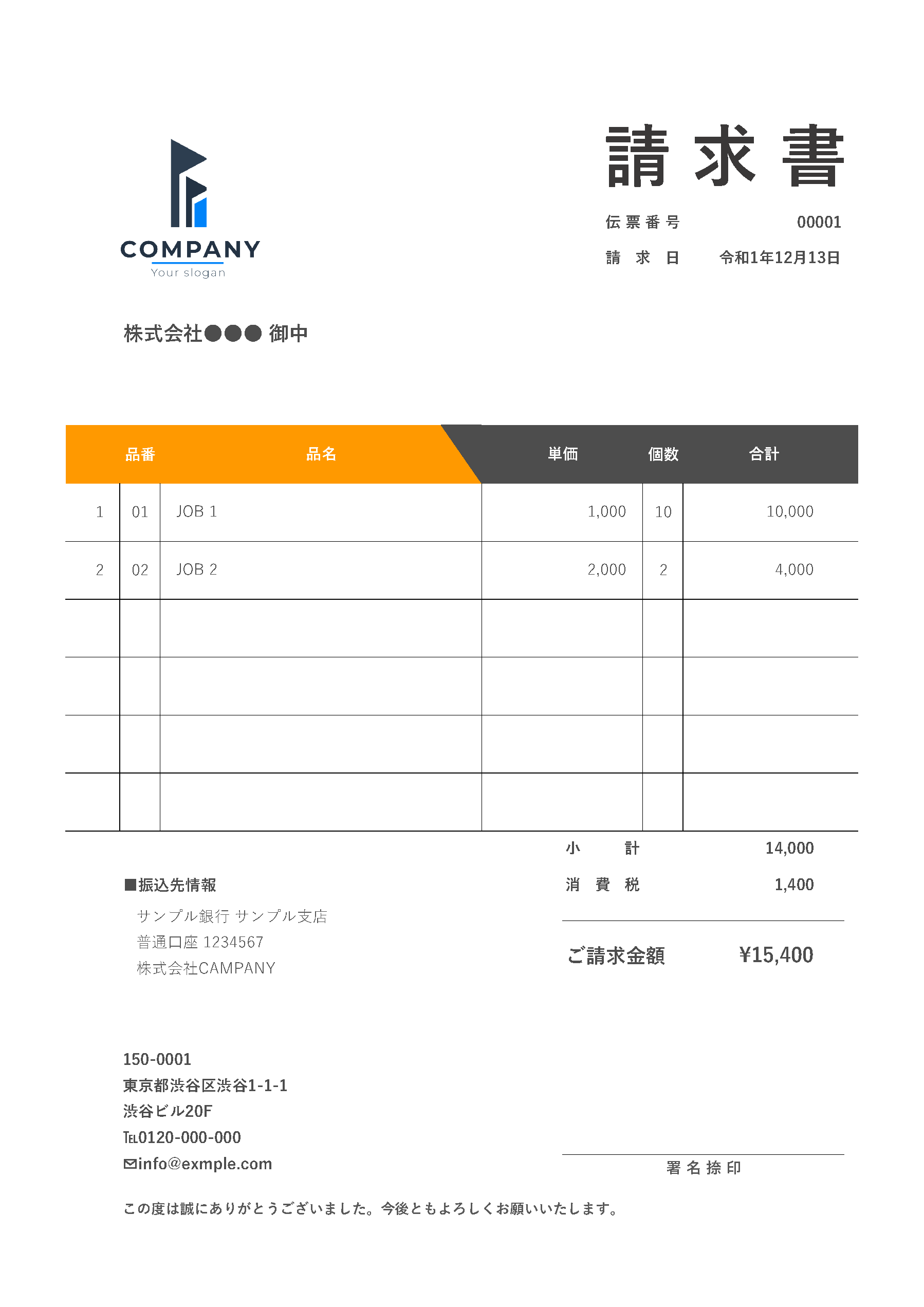 請求書 宛名の会社名・店舗名・個人名に変更可能 横型・横書きのエクセルとワードのテンプレ。