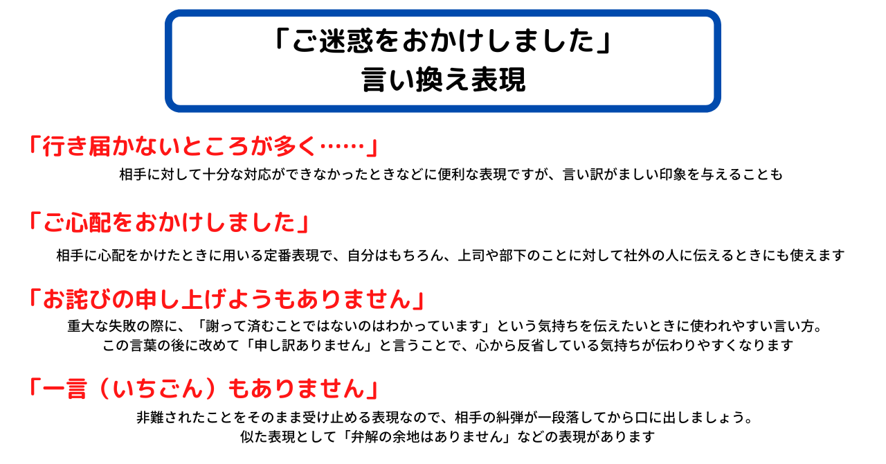 ご迷惑をおかけして申し訳ございませんでした」の意味と使い方、ビジネス例文&言い換え。目上への敬語文法KAIRYUSHA – ビジネス学習メディア。