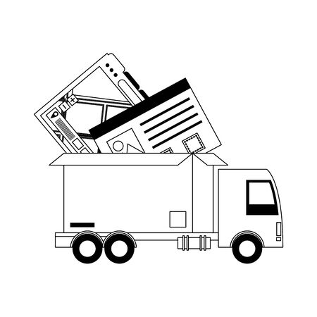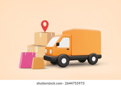商品とgpsの場所を追跡する漫画のベクトル図のグラフィックデザインを運ぶトラックでのロジスティックと配達の出荷のイラスト素材・ベクター Image134238550。