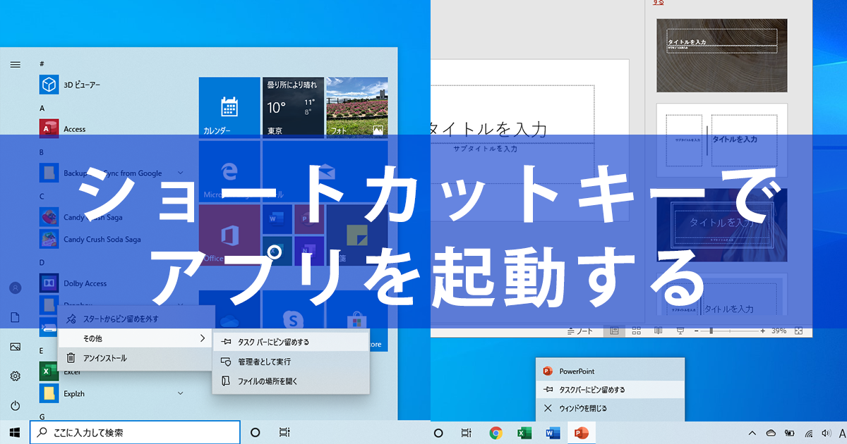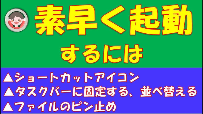 WordやExcelを素早く起動する方法です。デスクトップにショートカットアイコン、タスクバーに登録固定、並べ替え、ファイルのピン留めする方法です。