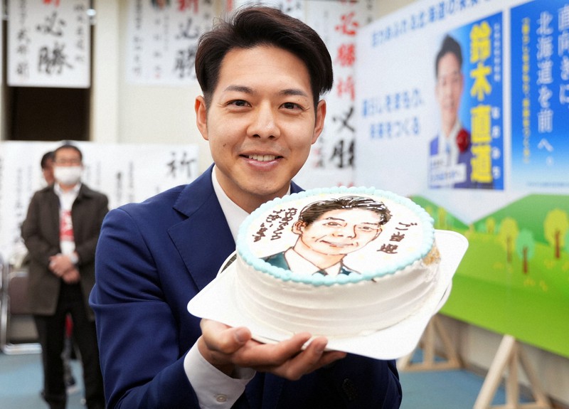 北海道知事再選の鈴木直道氏、ケーキに笑顔も「得票率7割、重い」毎日新聞。