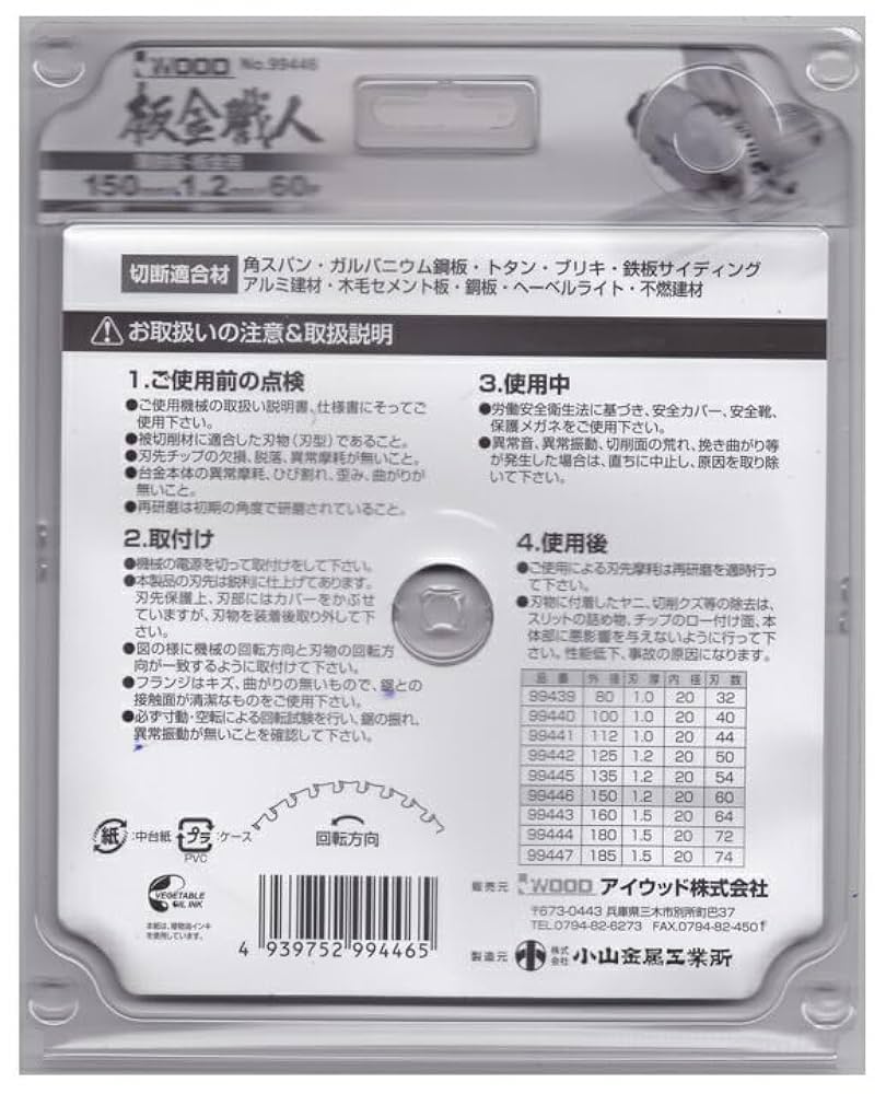 アイウッド チップソー 板金職人 150mm-60P No.99446 小山金属工業所 薄板金工用。