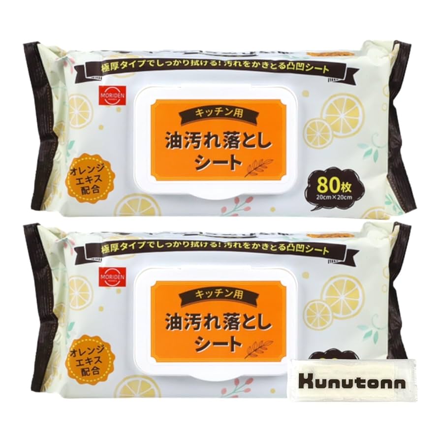 Amazonキッチン用 油汚れシート おそうじシート オレンジエキス配合 大容量 80枚 大判タイプ 2個セット +Kunutonnオリジナルロゴ入りhおしぼり付Kunutonn使い捨てクロス。