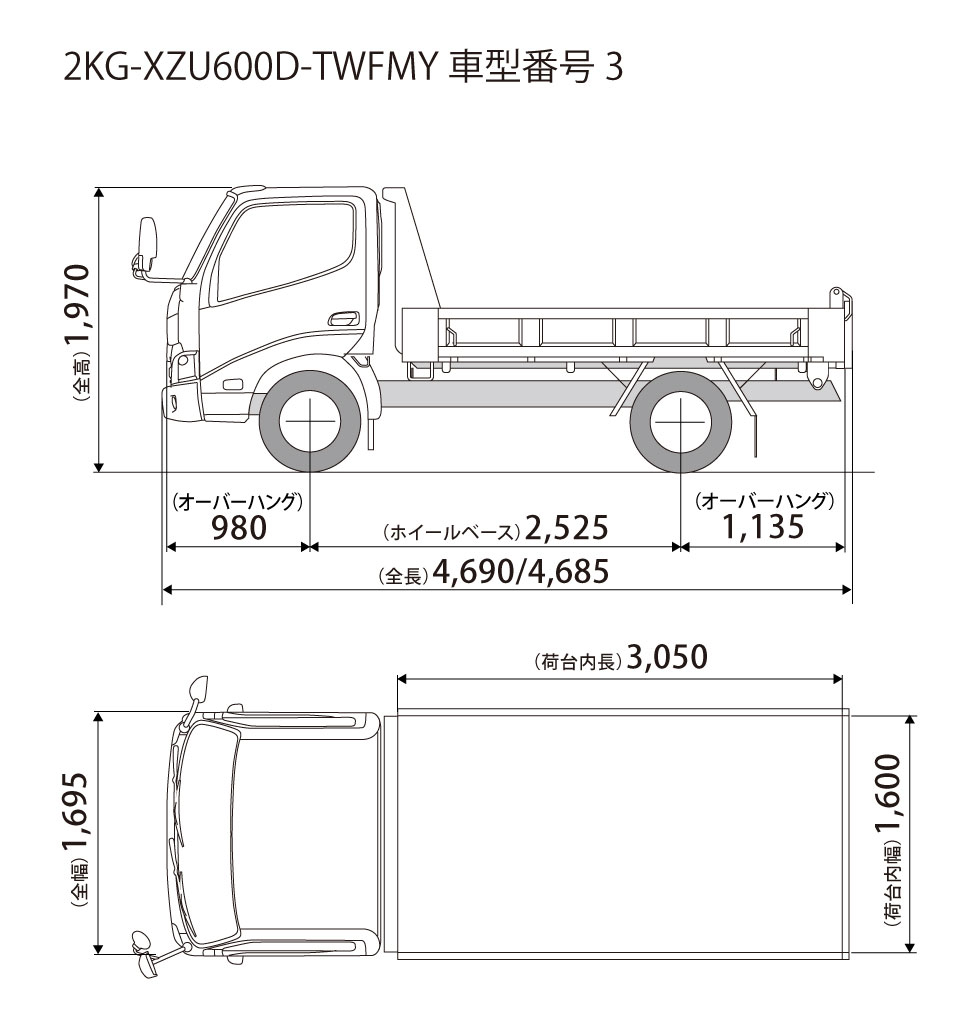 □2t平トラック車輌寸法図 高所作業車のエキスパートレンタル 株式会社スカイワーク京都。