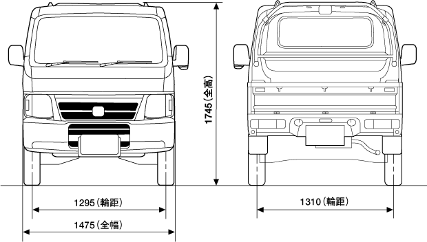 Hondaアクティ・トラック 2009年11月終了モデル 四面図正面図 背面図。