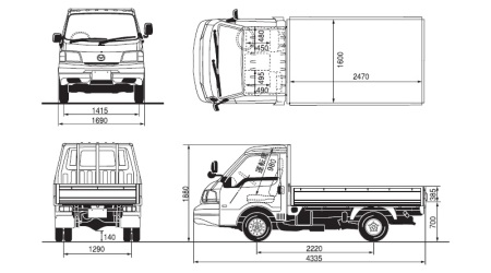 Hondaアクティ・トラック 2009年11月終了モデル 四面図。