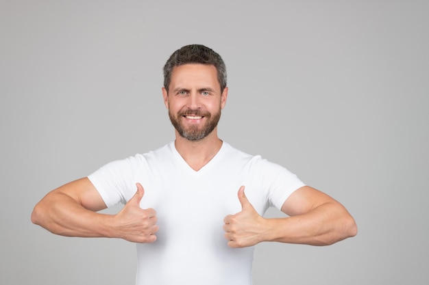 ダブルサムアップ幸せな男は親指のサインを与えるハンサムな男は親指を表示するThumbsups承認信号ベストチョイスコピースペースPremium写真。