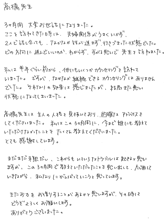 高橋先生は主人の人格を見抜いた 離婚回避 体験談 」夫婦カウンセリング高橋知子横浜相談室。