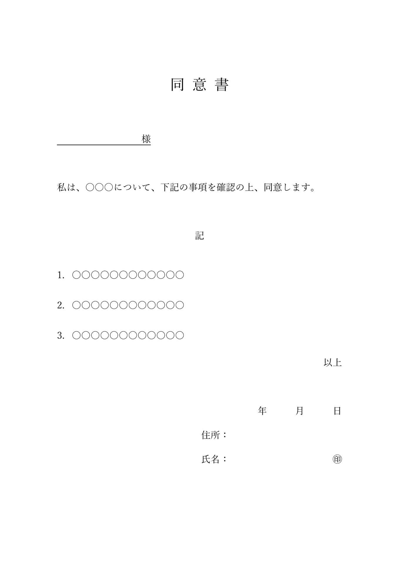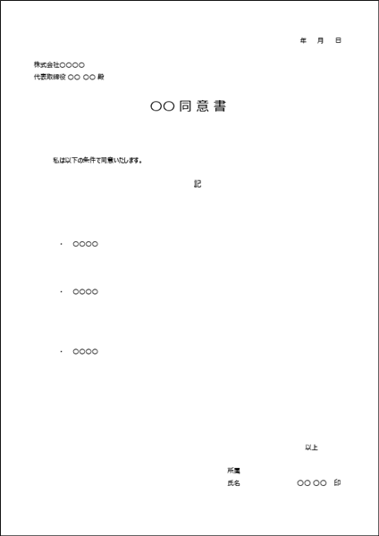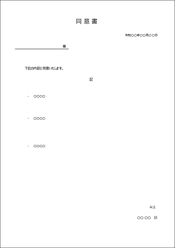 同意書・承諾書の書き方・例文・文例 様式・書式・フォーマット 雛形 ひな形テンプレート 基本手紙形式サブタイトル付き 03 ワードWord宛名が上別記が箇条書き形式-文書 テンプレートの無料ダウンロード。