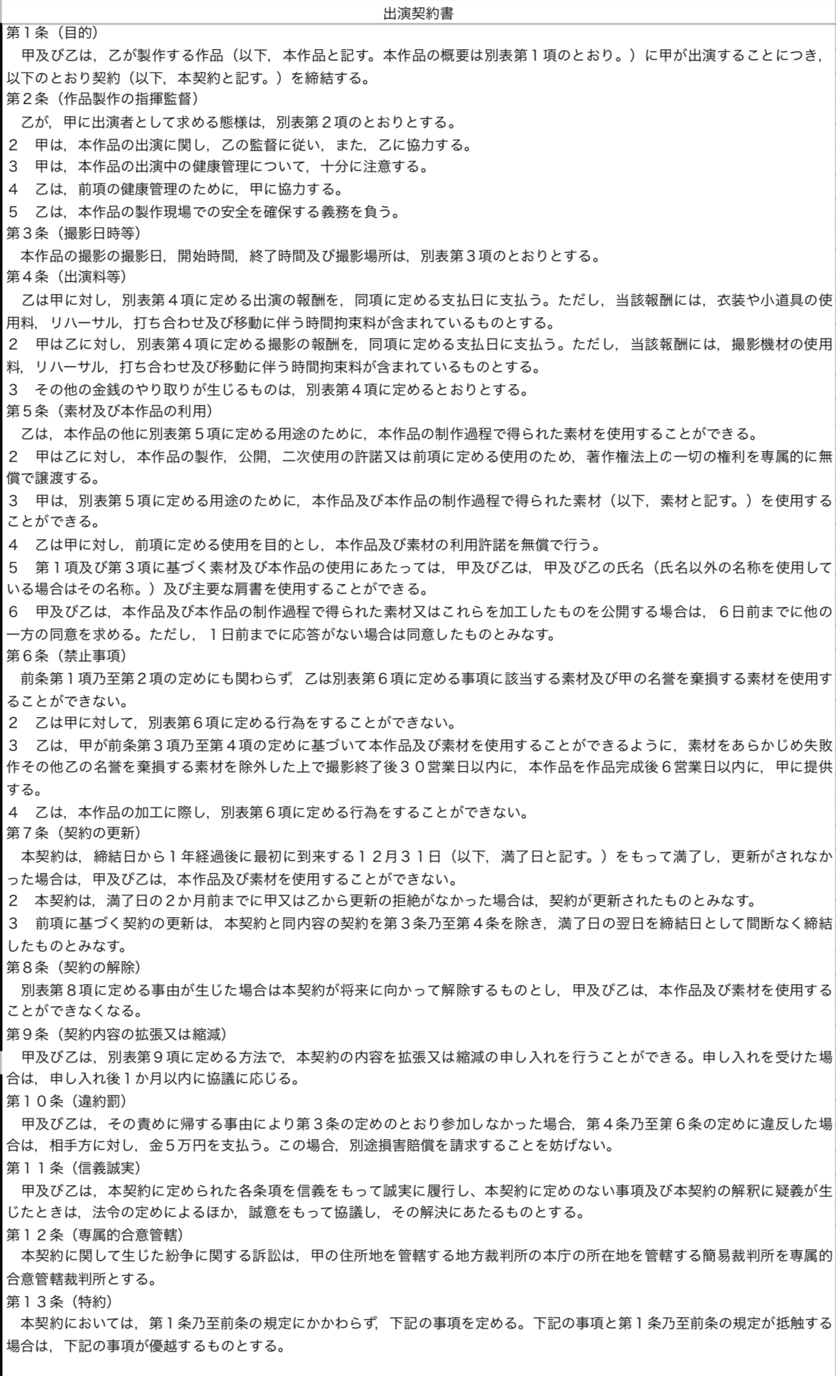 雛形 出演契約書 AV動画 上田行政書士事務所coconalaブログ。