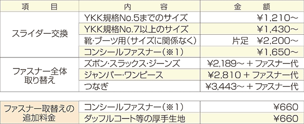 ファスナー修理、交換料金表洋服、靴、鞄の修理、寸法直し浜松市のレッツリフォーム。