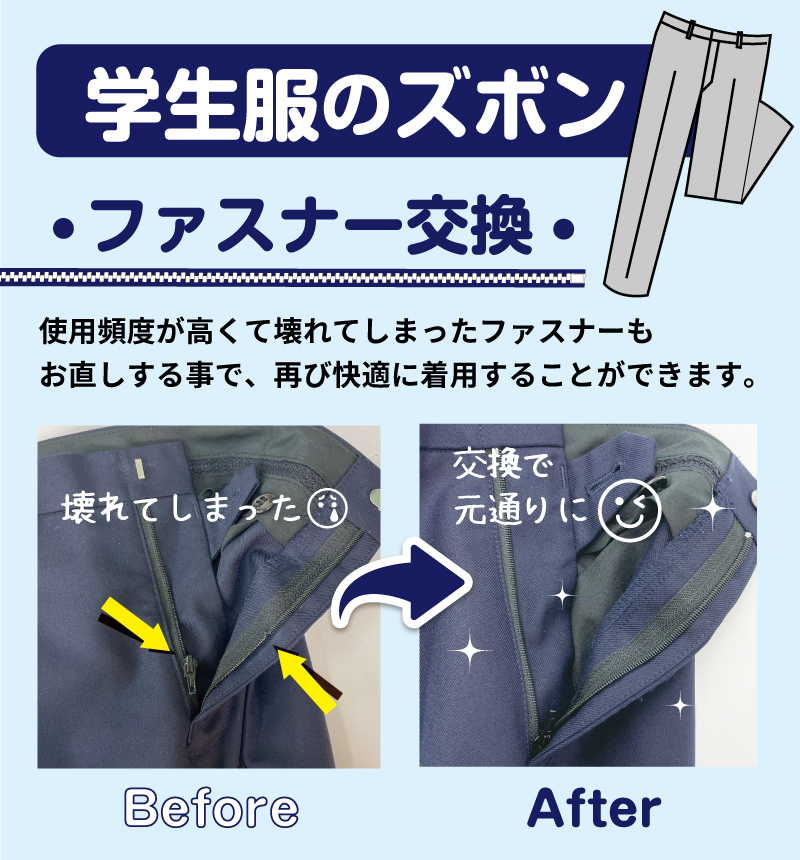 学生ズボンのファスナー交換、どうする?修理か買い替えか、お困りのあなたへ堺市で制服・法被・スーツなどのお直し・洋服リフォームなら 洋服のお直し・リフォームの専門店 リフォーム繕。